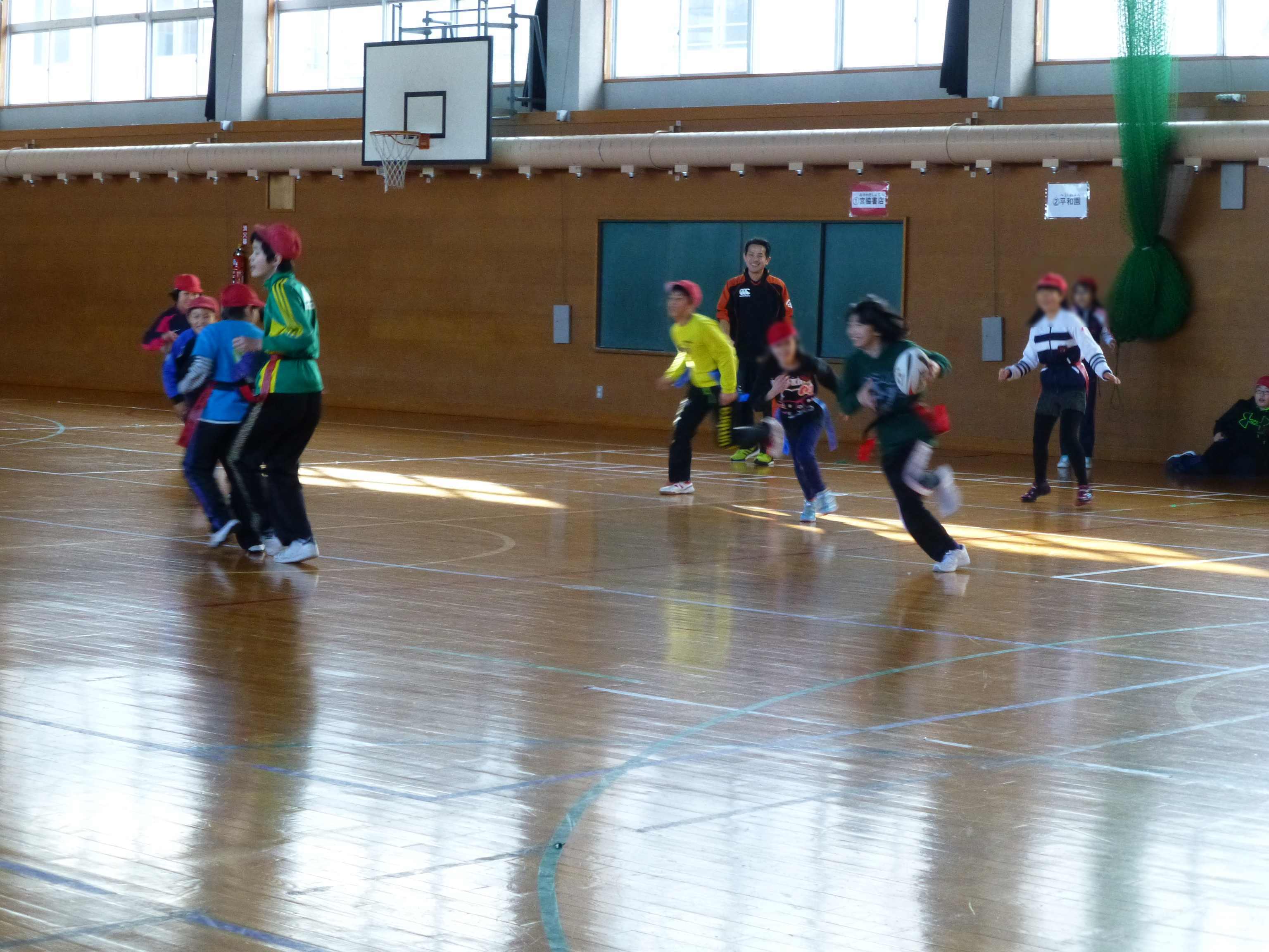 体力づくりの一環として,すべての学年でタグラグビーを体育の授業で取り組んでいます。指導はボランティアの力を借りて行っています。毎年,運動不足になる冬に行っています。冬の寒さにも負けず,汗いっぱいになって活動する子供たちの姿が見られます。