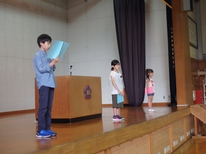 70日間の1学期が本日で終了し、明日からは楽しみにしていた夏休みが始まります。終業式の中では、校長先生が「1学期を振り返ってみましょう」と、いろいろな取組の写真を用意してくださり、1学期の様子を全員で振り返ることができました。入学式、遠足、運動会、勉強、参観日、クラブ、防災訓練、農園、外国語、花壇、クリーン作戦などなど…。振り返ってみると本当にいろいろなことがあり、自分たちの頑張りや成長をもう1度見つめ直す素敵な時間となりました。その後、代表児童の作文発表があり、1学期の思い出と夏休みの楽しみについて立派に発表してくれました。また、式の中で歌った校歌の歌声は大変素晴らしいもので、子ども達の大きな成長を実感させられました。27日後に、子ども達がいい顔で学校に戻ってくることを願っています。健康と交通安全には気を付けて、充実した毎日を過ごしてください。