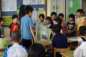1学期最終日となった本日、いつもは5・6年生の落ち着いた空気が流れる3階に、かわいらしいワイワイとした声が響きました。これは、入学以来いろいろな面でお世話になった6年生に、1年生がお礼のメッセージを伝えに行くという場面があったからなのですが、静かに朝学習をしている6年生教室にかわいらしい1年生が入っていくと、6年生の子ども達の表情も自然に緩み、何とも言えぬ優しい空気が流れました。「ありがとうございました」を懸命に伝える1年生と、それを温かく見守る6年生。どちらにとっても大切な、貴重な時間を共有してきたことがわかる瞬間でした。6年生のみなさん、本当にどうもありがとう!
