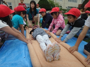 17日に、防災訓練が行われました。本物の消化器を使った消火、天ぷら油火災の窒息消火、学校の消防設備を実際に稼働させた訓練、毛布を使った応急救急搬送と、短い時間ではありましたが、中身の濃い本格的な訓練となりました。花園小の子ども達にとっては当たり前のことかもしれませんが、これだけの訓練を毎年当たり前に行うことができ、いざというときの対応を知っているというのは今後にとって非常に大きなことです。学んだことを生かす場面は来ないのが1番ですが、今回の学びをしっかりと自分の財産にしてほしいです。