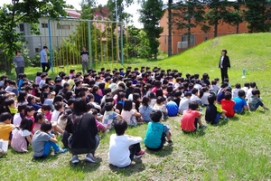 38度!なんていう信じられないような熱気の週末でしたが、学校は先週からそれ以上の熱気に包まれています。それは運動会に向けた特別時間割が始まったからなのですが、先週の金曜日には赤白に分かれての結団式も行われ、運動会ムードがいよいよ高まってきました。花園小学校の運動会は最高学年の6年生の活躍の場面がいっぱいです。結団式でも、応援団の子を中心に自分たちの手で全てを進め、リーダーとしての役割をしっかりと果してくれました。これからの毎日の中では、応援団だけでなく、6年生全体のリーダーシップが大切になってきます。子ども達の頑張りに大いに期待したいです!