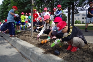 このフラワーロード事業は,帯広市各所で行われており,市内では数十か所に上るそうです。全部で3万5000株の花が植えられているとのこと。この取組は30年以上前から行われていて,小学生も参加しているのは,帯広市内でも,ここ花園小学校だけだそうです。自分たちで心を込めて植えた花たちですから,通るたびに成長が楽しみになります。