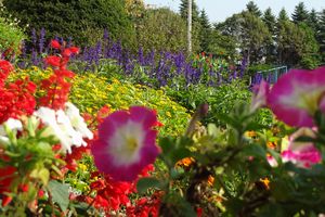 校 章 円を背景に,むらさきつつじの花びらを配置,中央に花園の二文字を配字。背景の色は緑で,地球を表している。本校は国際理解教育を積極的に推進しており,人類の平和と人間尊重の精神を培い,また,豊かな地球の自然を守っていこうとの願いがこめられている。