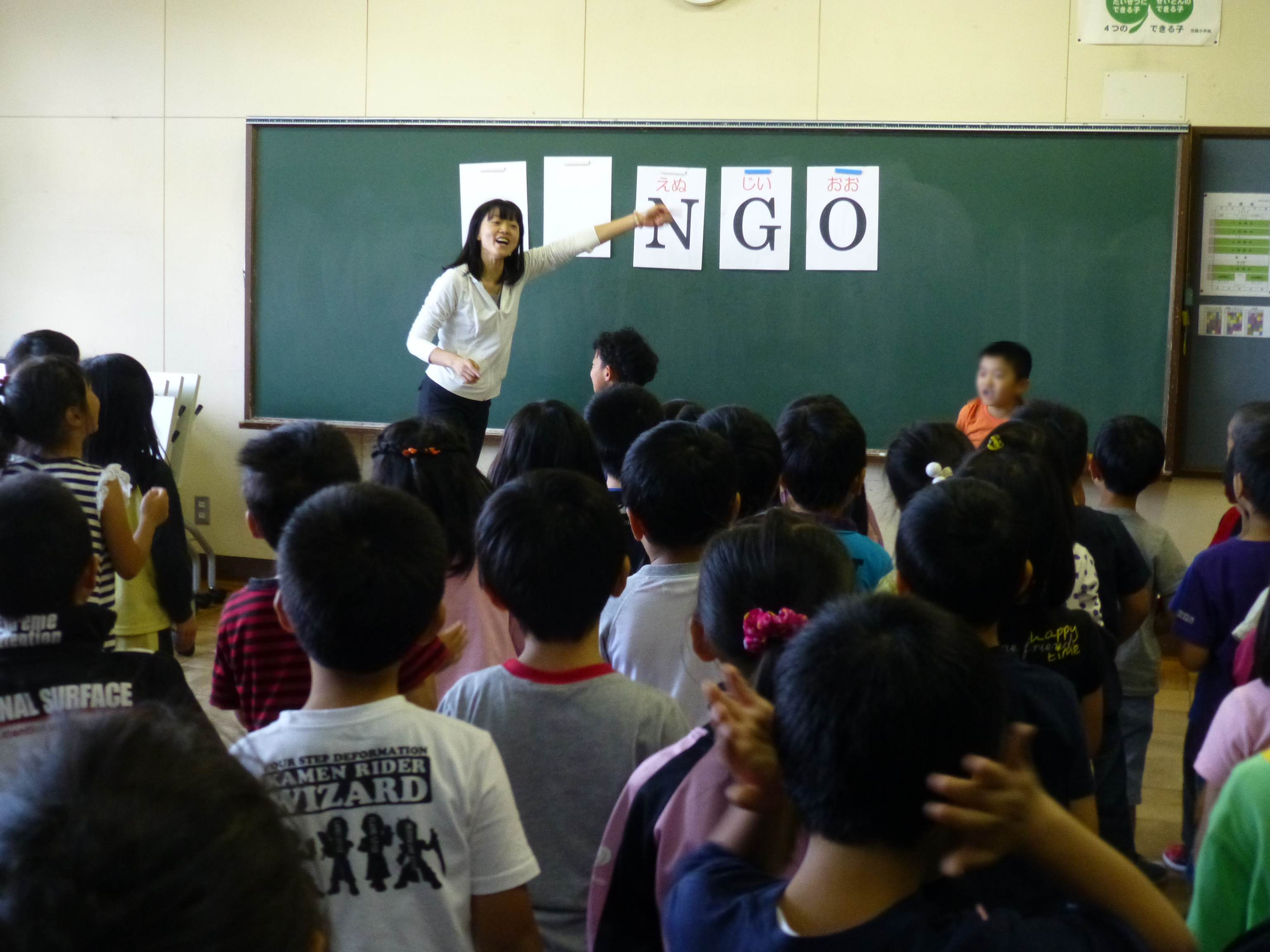 文部科学省の委託事業である英語活動等国際理解活動推進事業拠点校としての実践も積んできた本校は,外国語活動の取り組みも盛んです。毎年3月には6年生を対象に,四中エリアファミリーである第四中学校の協力を得て,小中連携事業の一環として中学校の英語の先生による授業が行われます。楽しいひと時を通して進学への期待を膨らませます。また,月曜日に行われるブロック集会でも,低・中・高に分かれて歌やゲームを通して外国語に親しんでいます。