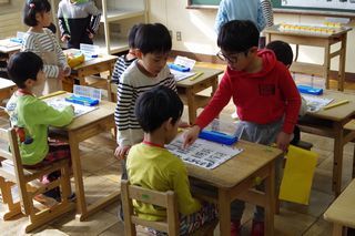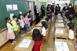 今日は4月から花園小学校の仲間になる新1年生の体験入学が行われました。メインのプログラムは「勉強体験」です。国語、算数、図工の3グループに分かれ、現1年生が先生役の教室でそれぞれの学習を体験しました。新1年生はどのグループも鉛筆で書いたり工作を作ったりと真剣そのもので、入学してからの活躍がとても楽しみになりました。そして現1年生は、さすがもうすぐ2年生です。優しく教えてあげたり、褒め言葉をかけてあげたりと、こちらも4月からが楽しみになる様子でした。最後はみんなで校歌をプレゼントしたのですが、一つ学年が上がる喜びと、新しく1年生になる喜びとで、どの子の目もきらきらと輝いていました。新1年生のみんな、入学を待っているからね!