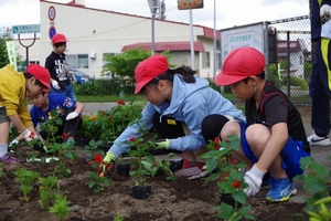 このフラワーロード事業は,帯広市各所で行われており,市内では数十か所に上るそうです。全部で3万5000株の花が植えられているとのこと。この取組は30年以上前から行われていて,小学生も参加しているのは,帯広市内でも,ここ花園小学校だけだそうです。自分たちで心を込めて植えた花たちですから,通るたびに成長が楽しみになります。
