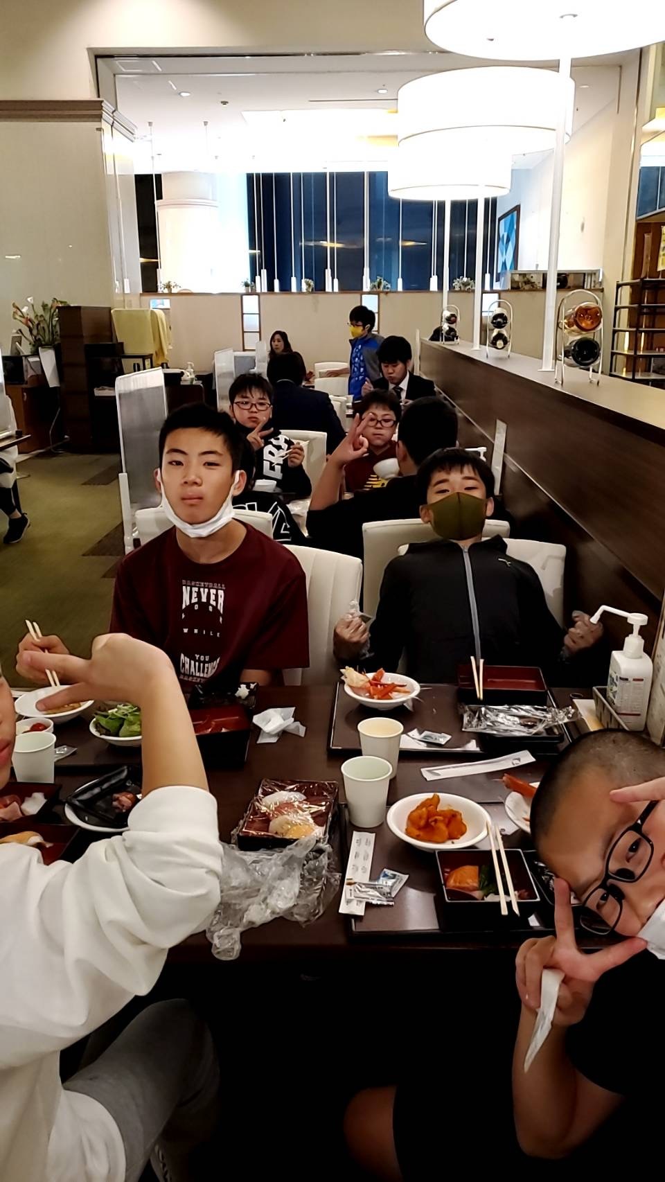 夕食の様子 昨日更新できなかった夕食の様子です。感染対策のため、手袋をして料理を取りに行くのは少々面倒だったようですが、何度もバイキングの料理を取りに行き、もりもり食べ、お風呂にもゆっくり入って二日目への鋭気を養ったようです。